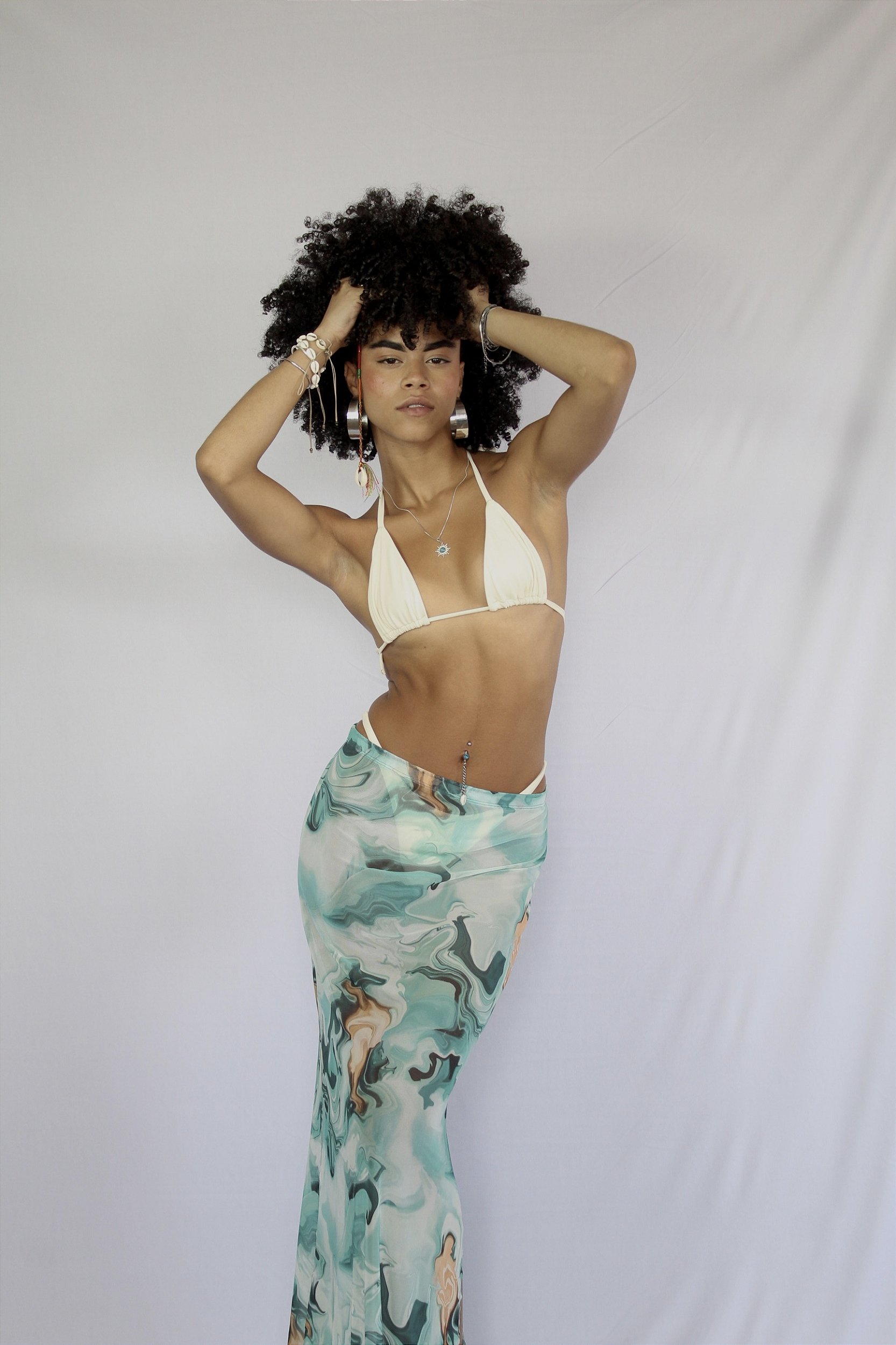 Saia de Tule 3 em 1 com forro removivel, contendo 1 saia longa de tule com fendas e 1 saia curta, possibiltando o uso em 3 formas diferentes para compor looks da praia ao dia a dia.
