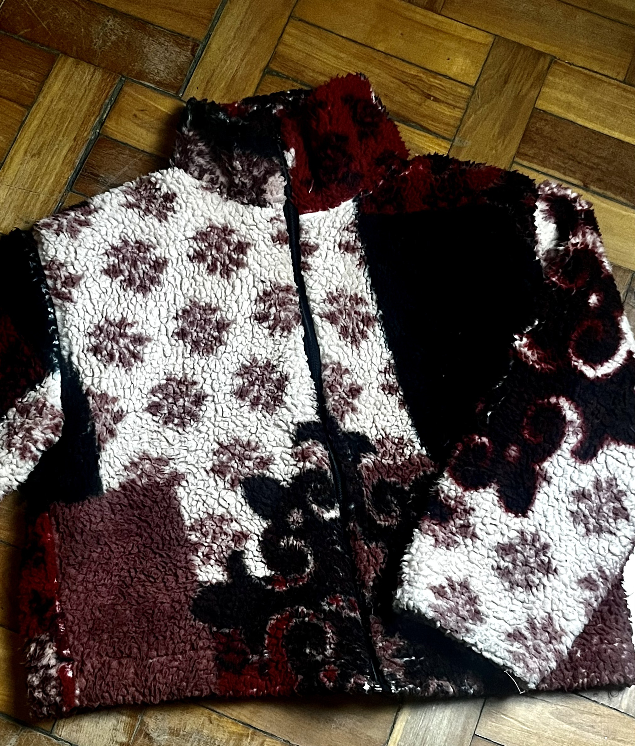 Jaqueta de pelinho com estampa, gola alta e zíper frontal.
