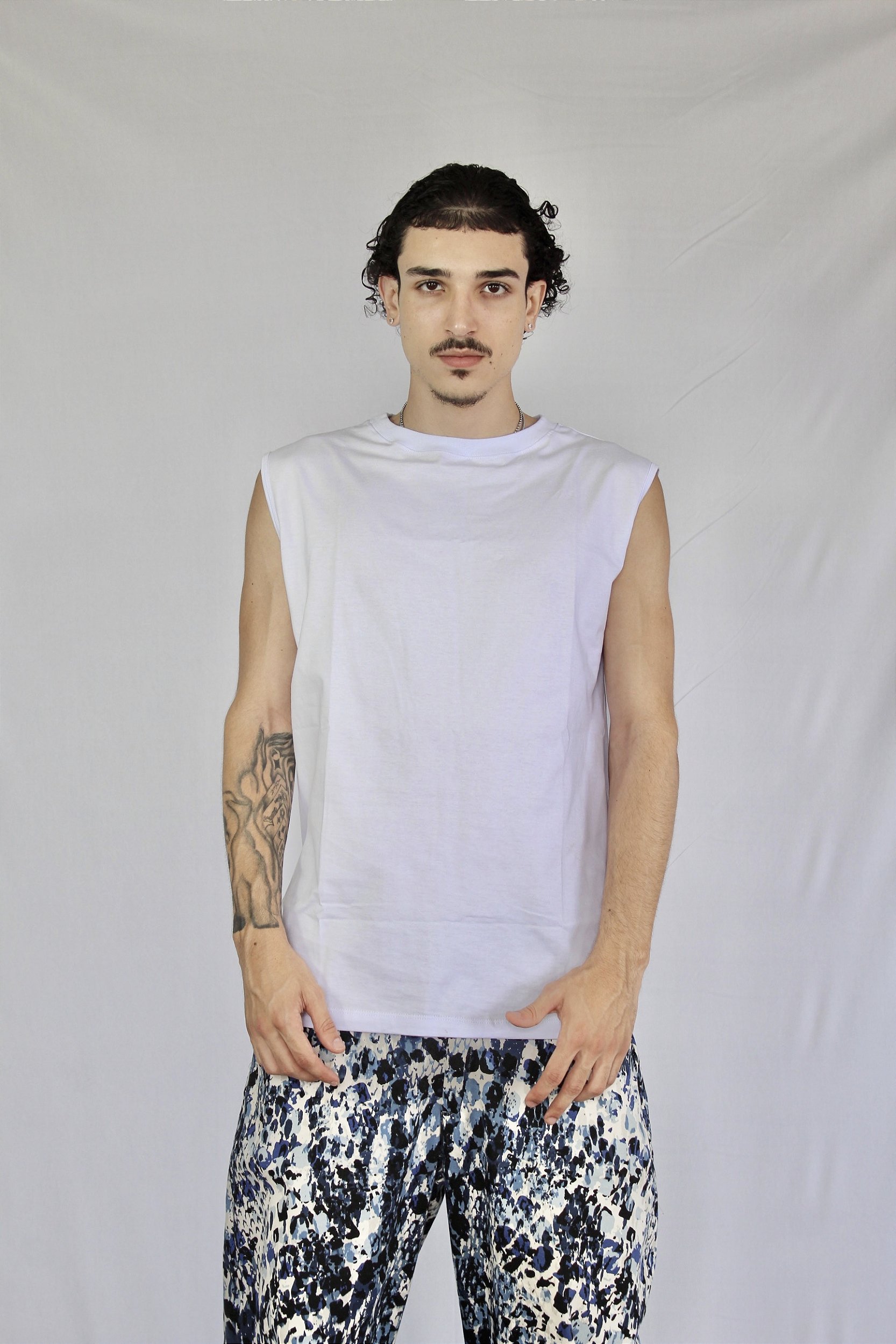 Regata Maculina com corte oversized, produzida em malha 100% algodão fio 30.1 penteado.