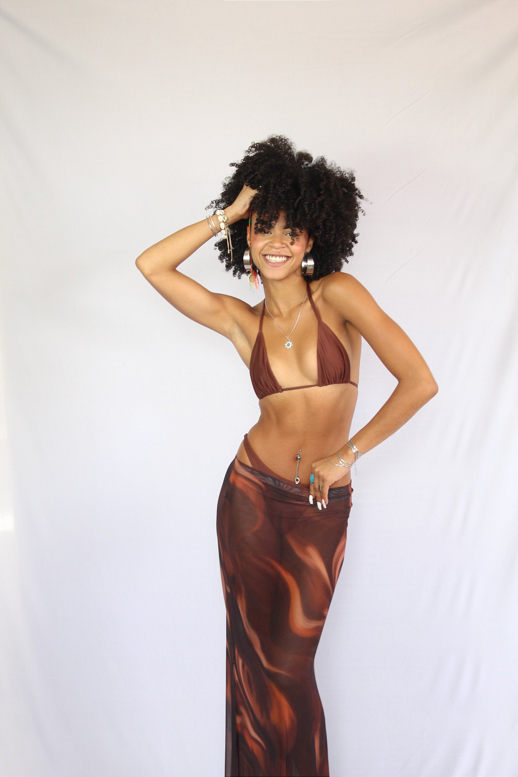 Saia de Tule 3 em 1 com forro removivel, contendo 1 saia longa de tule com fendas e 1 saia curta, possibiltando o uso em 3 formas diferentes para compor looks da praia ao dia a dia.