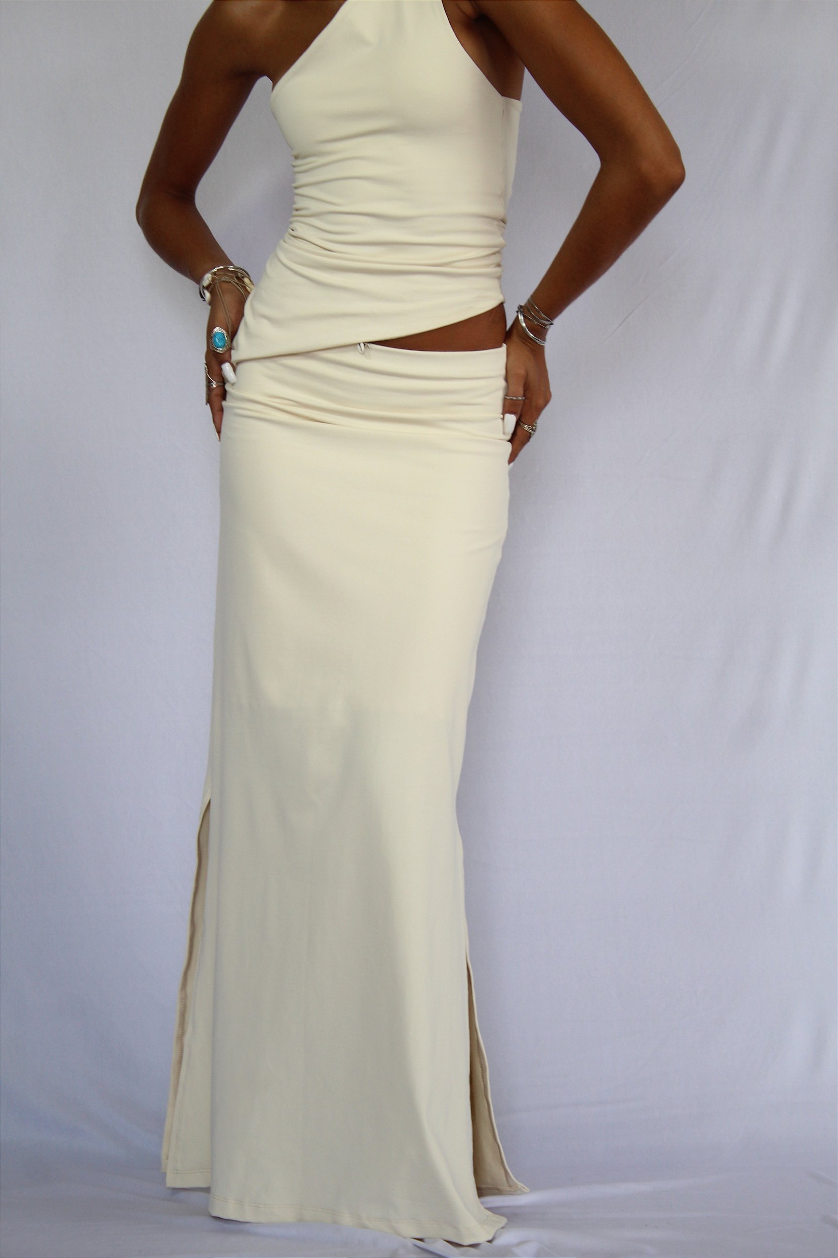 Saia longa com leve evase, fenda e forro..